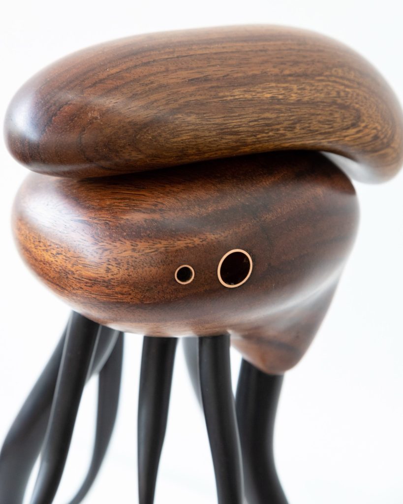 Дональд Wasswa из Кампалы (Уганда) мастерски сочетает дерево из шелковых акаций (albizia), чёрный эбен и металлические вставки, создавая скульптуры, напоминающие сияющих медуз с удлинёнными щупальцами — одновременно знакомые и тревожные, словно вышедшие из научной фантастики. Эти работы воплощают напряжение между привычным и неизвестным, между живым существом и мифическим артефактом.