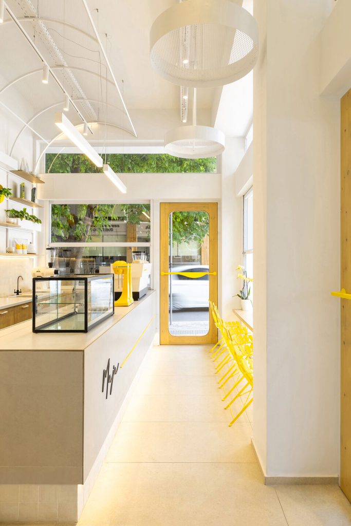 Интерьер площадью 35 м² организован вокруг длинной центральной стойки, ставшей опорой пространства и социальной артерией заведения. Доминируют светлые поверхности: белый минимализм контрастируется тёплыми вставками из дуба и яркими лимонно-жёлтыми акцентами — от мебели до деталей — навевая атмосферу Средиземноморья и греческих островов. Всё аккуратно продумано до мелочей: от плавных изгибов полок и светильников до керамических элементов и растений, создающих ощущение живого, развивающегося пространства.