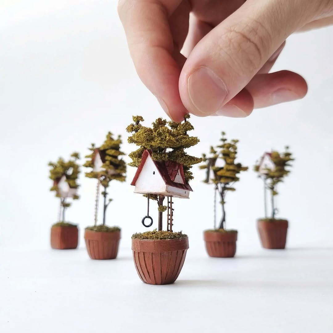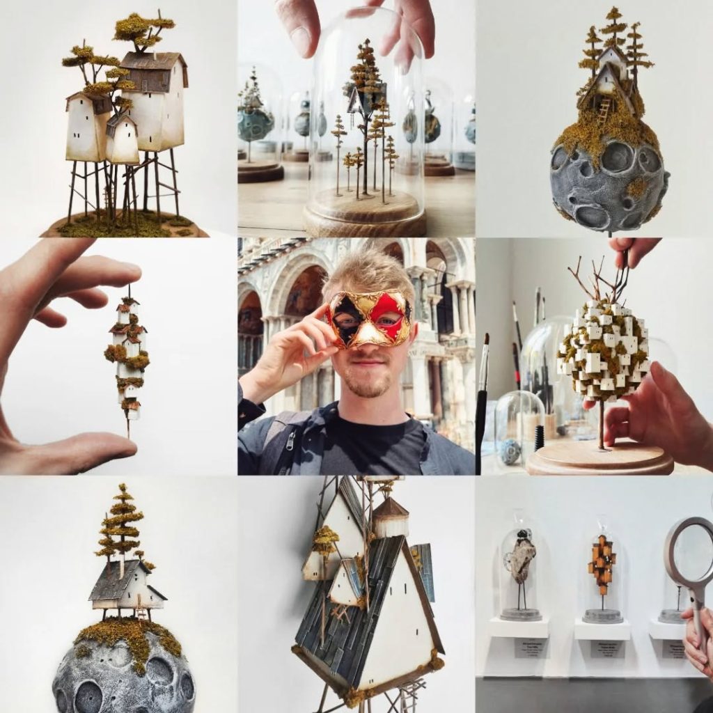Материалы художника — дерево, бумага, картон, иногда бетон или стекло — всё продуманно до деталей: текстуры, композиции, баланс между жесткостью и природной мягкостью. Работы Давыдова — это исследование дома, корней и того, как эмоции и атмосфера могут быть переданы в миниатюре так, что они ощущаются настоящими, несмотря на малый масштаб.