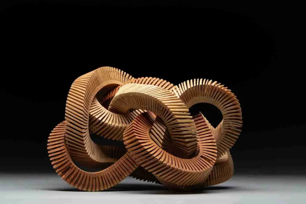 В своих работах Кристиан Бурхард исследует возможности дерева как скульптурного материала. Он собирает формы из отдельных сегментов, создавая ощущение закрученного движения и внутреннего напряжения, словно объекты находятся в процессе трансформации.