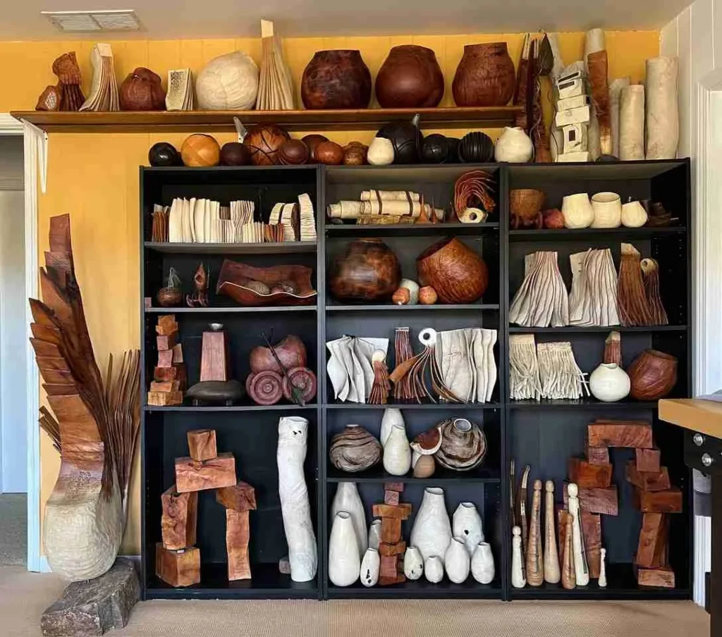 Скульптуры выглядят одновременно динамичными и сбалансированными. Тщательная работа с фактурой и направлением волокон подчёркивает природное происхождение материала, сохраняя диалог между органикой дерева и точной, выверенной геометрией формы.
